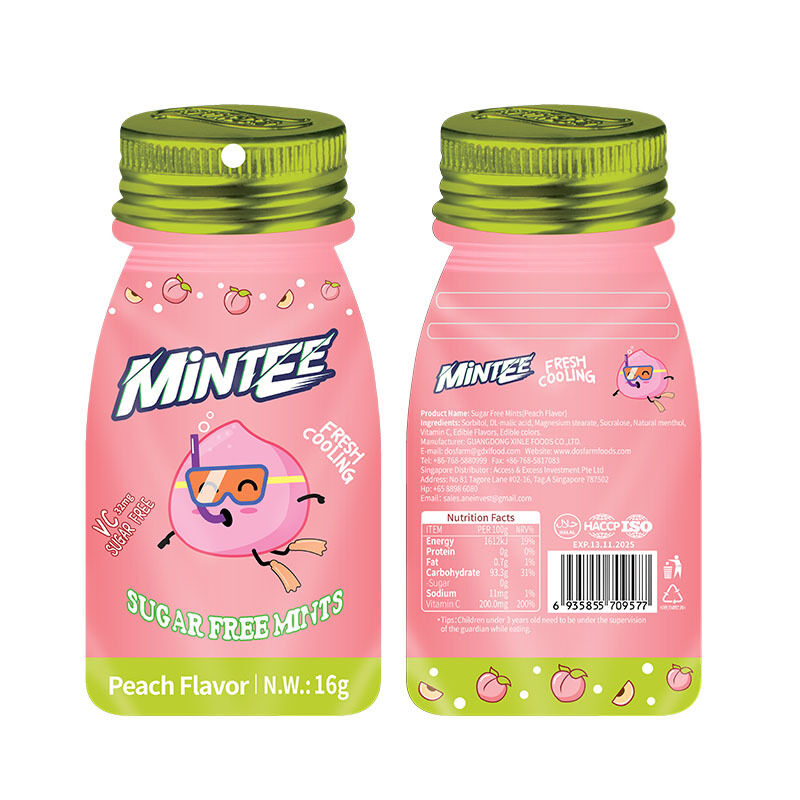 | Verkaufspunkte | ohne Zucker, Vitamin C, erfrischt den Atem, kühlend, sauer und süßer Geschmack, patentiertes Flaschendesign |